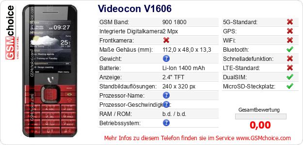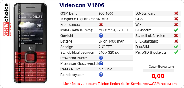 Hast du eigene Webseite? Willst du die Informationen über Standarddaten des Handys Videocon V1606 irgendwo veröffentlichen? Das ist sehr einfach. Du kannst das Bild herunterladen oder kopieren und auf der Webseite folgenden Code hinzufügen:Das Einfügen von diesem Code verursacht das Anzeigen von dem folgenden Bild: