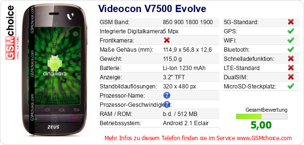 Hast du eigene Webseite? Willst du die Informationen über Standarddaten des Handys Videocon V7500 Evolve irgendwo veröffentlichen? Das ist sehr einfach. Du kannst das Bild herunterladen oder kopieren und auf der Webseite folgenden Code hinzufügen:Das Einfügen von diesem Code verursacht das Anzeigen von dem folgenden Bild: