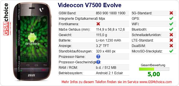 Daten des Mobiltelefons Videocon V7500 Evolve auf Ihrer Seite
