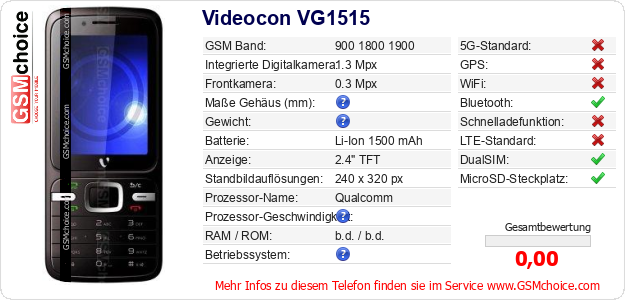 Hast du eigene Webseite? Willst du die Informationen über Standarddaten des Handys Videocon VG1515 irgendwo veröffentlichen? Das ist sehr einfach. Du kannst das Bild herunterladen oder kopieren und auf der Webseite folgenden Code hinzufügen:Das Einfügen von diesem Code verursacht das Anzeigen von dem folgenden Bild: