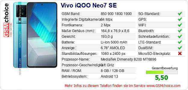 Hast du eigene Webseite? Willst du die Informationen über Standarddaten des Handys Vivo iQOO Neo7 SE irgendwo veröffentlichen? Das ist sehr einfach. Du kannst das Bild herunterladen oder kopieren und auf der Webseite folgenden Code hinzufügen:Das Einfügen von diesem Code verursacht das Anzeigen von dem folgenden Bild: