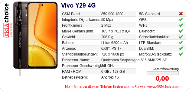 Hast du eigene Webseite? Willst du die Informationen über Standarddaten des Handys Vivo Y29 4G irgendwo veröffentlichen? Das ist sehr einfach. Du kannst das Bild herunterladen oder kopieren und auf der Webseite folgenden Code hinzufügen:Das Einfügen von diesem Code verursacht das Anzeigen von dem folgenden Bild: