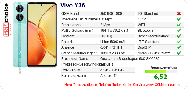 Hast du eigene Webseite? Willst du die Informationen über Standarddaten des Handys Vivo Y36 irgendwo veröffentlichen? Das ist sehr einfach. Du kannst das Bild herunterladen oder kopieren und auf der Webseite folgenden Code hinzufügen:Das Einfügen von diesem Code verursacht das Anzeigen von dem folgenden Bild: