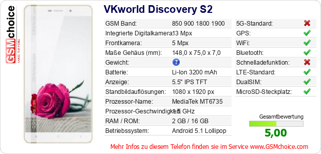 Hast du eigene Webseite? Willst du die Informationen über Standarddaten des Handys VKworld Discovery S2 irgendwo veröffentlichen? Das ist sehr einfach. Du kannst das Bild herunterladen oder kopieren und auf der Webseite folgenden Code hinzufügen:Das Einfügen von diesem Code verursacht das Anzeigen von dem folgenden Bild: