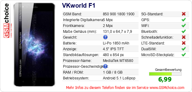Hast du eigene Webseite? Willst du die Informationen über Standarddaten des Handys VKworld F1 irgendwo veröffentlichen? Das ist sehr einfach. Du kannst das Bild herunterladen oder kopieren und auf der Webseite folgenden Code hinzufügen:Das Einfügen von diesem Code verursacht das Anzeigen von dem folgenden Bild: