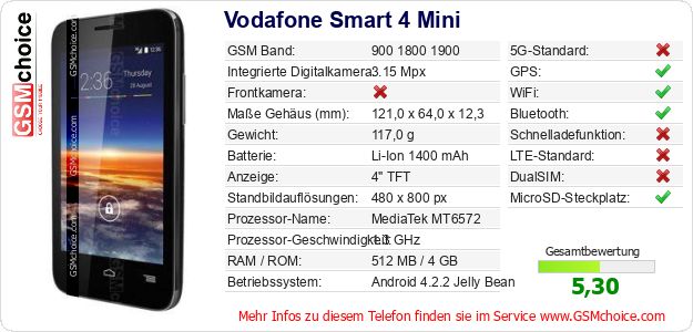 Hast du eigene Webseite? Willst du die Informationen über Standarddaten des Handys Vodafone Smart 4 Mini irgendwo veröffentlichen? Das ist sehr einfach. Du kannst das Bild herunterladen oder kopieren und auf der Webseite folgenden Code hinzufügen:Das Einfügen von diesem Code verursacht das Anzeigen von dem folgenden Bild: