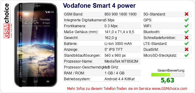 Hast du eigene Webseite? Willst du die Informationen über Standarddaten des Handys Vodafone Smart 4 power irgendwo veröffentlichen? Das ist sehr einfach. Du kannst das Bild herunterladen oder kopieren und auf der Webseite folgenden Code hinzufügen:Das Einfügen von diesem Code verursacht das Anzeigen von dem folgenden Bild:
