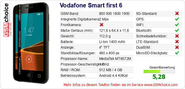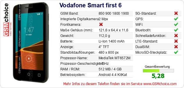 Hast du eigene Webseite? Willst du die Informationen über Standarddaten des Handys Vodafone Smart first 6 irgendwo veröffentlichen? Das ist sehr einfach. Du kannst das Bild herunterladen oder kopieren und auf der Webseite folgenden Code hinzufügen:Das Einfügen von diesem Code verursacht das Anzeigen von dem folgenden Bild: