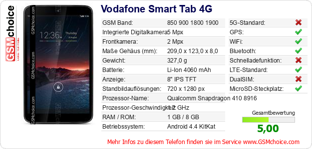 Hast du eigene Webseite? Willst du die Informationen über Standarddaten des Handys Vodafone Smart Tab 4G irgendwo veröffentlichen? Das ist sehr einfach. Du kannst das Bild herunterladen oder kopieren und auf der Webseite folgenden Code hinzufügen:Das Einfügen von diesem Code verursacht das Anzeigen von dem folgenden Bild:
