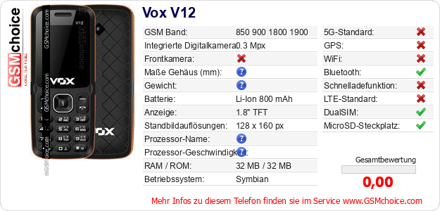 Hast du eigene Webseite? Willst du die Informationen über Standarddaten des Handys Vox V12 irgendwo veröffentlichen? Das ist sehr einfach. Du kannst das Bild herunterladen oder kopieren und auf der Webseite folgenden Code hinzufügen:Das Einfügen von diesem Code verursacht das Anzeigen von dem folgenden Bild: