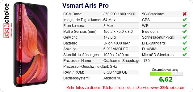 Hast du eigene Webseite? Willst du die Informationen über Standarddaten des Handys Vsmart Aris Pro irgendwo veröffentlichen? Das ist sehr einfach. Du kannst das Bild herunterladen oder kopieren und auf der Webseite folgenden Code hinzufügen:Das Einfügen von diesem Code verursacht das Anzeigen von dem folgenden Bild: