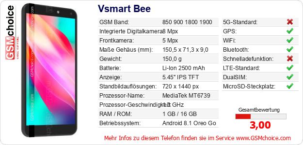 Hast du eigene Webseite? Willst du die Informationen über Standarddaten des Handys Vsmart Bee irgendwo veröffentlichen? Das ist sehr einfach. Du kannst das Bild herunterladen oder kopieren und auf der Webseite folgenden Code hinzufügen:Das Einfügen von diesem Code verursacht das Anzeigen von dem folgenden Bild: