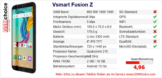 Hast du eigene Webseite? Willst du die Informationen über Standarddaten des Handys Vsmart Fusion Z irgendwo veröffentlichen? Das ist sehr einfach. Du kannst das Bild herunterladen oder kopieren und auf der Webseite folgenden Code hinzufügen:Das Einfügen von diesem Code verursacht das Anzeigen von dem folgenden Bild: