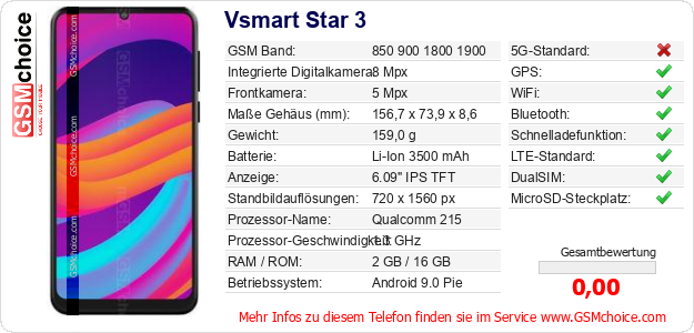 Hast du eigene Webseite? Willst du die Informationen über Standarddaten des Handys Vsmart Star 3 irgendwo veröffentlichen? Das ist sehr einfach. Du kannst das Bild herunterladen oder kopieren und auf der Webseite folgenden Code hinzufügen:Das Einfügen von diesem Code verursacht das Anzeigen von dem folgenden Bild: