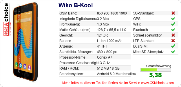 Hast du eigene Webseite? Willst du die Informationen über Standarddaten des Handys Wiko B-Kool irgendwo veröffentlichen? Das ist sehr einfach. Du kannst das Bild herunterladen oder kopieren und auf der Webseite folgenden Code hinzufügen:Das Einfügen von diesem Code verursacht das Anzeigen von dem folgenden Bild: