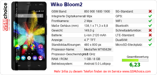 Hast du eigene Webseite? Willst du die Informationen über Standarddaten des Handys Wiko Bloom2 irgendwo veröffentlichen? Das ist sehr einfach. Du kannst das Bild herunterladen oder kopieren und auf der Webseite folgenden Code hinzufügen:Das Einfügen von diesem Code verursacht das Anzeigen von dem folgenden Bild: