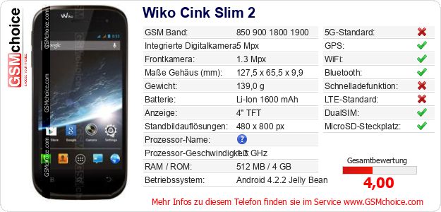 Hast du eigene Webseite? Willst du die Informationen über Standarddaten des Handys Wiko Cink Slim 2 irgendwo veröffentlichen? Das ist sehr einfach. Du kannst das Bild herunterladen oder kopieren und auf der Webseite folgenden Code hinzufügen:Das Einfügen von diesem Code verursacht das Anzeigen von dem folgenden Bild: