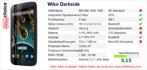 Hast du eigene Webseite? Willst du die Informationen über Standarddaten des Handys Wiko Darkside irgendwo veröffentlichen? Das ist sehr einfach. Du kannst das Bild herunterladen oder kopieren und auf der Webseite folgenden Code hinzufügen:Das Einfügen von diesem Code verursacht das Anzeigen von dem folgenden Bild: