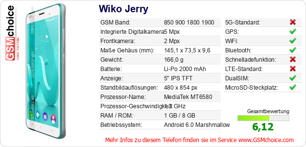 Hast du eigene Webseite? Willst du die Informationen über Standarddaten des Handys Wiko Jerry irgendwo veröffentlichen? Das ist sehr einfach. Du kannst das Bild herunterladen oder kopieren und auf der Webseite folgenden Code hinzufügen:Das Einfügen von diesem Code verursacht das Anzeigen von dem folgenden Bild: