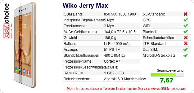 Hast du eigene Webseite? Willst du die Informationen über Standarddaten des Handys Wiko Jerry Max irgendwo veröffentlichen? Das ist sehr einfach. Du kannst das Bild herunterladen oder kopieren und auf der Webseite folgenden Code hinzufügen:Das Einfügen von diesem Code verursacht das Anzeigen von dem folgenden Bild: