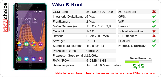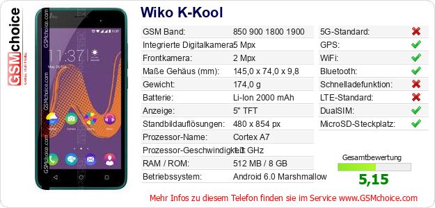 Hast du eigene Webseite? Willst du die Informationen über Standarddaten des Handys Wiko K-Kool irgendwo veröffentlichen? Das ist sehr einfach. Du kannst das Bild herunterladen oder kopieren und auf der Webseite folgenden Code hinzufügen:Das Einfügen von diesem Code verursacht das Anzeigen von dem folgenden Bild: