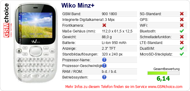 Hast du eigene Webseite? Willst du die Informationen über Standarddaten des Handys Wiko Minz+ irgendwo veröffentlichen? Das ist sehr einfach. Du kannst das Bild herunterladen oder kopieren und auf der Webseite folgenden Code hinzufügen:Das Einfügen von diesem Code verursacht das Anzeigen von dem folgenden Bild: