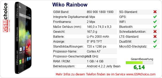 Hast du eigene Webseite? Willst du die Informationen über Standarddaten des Handys Wiko Rainbow irgendwo veröffentlichen? Das ist sehr einfach. Du kannst das Bild herunterladen oder kopieren und auf der Webseite folgenden Code hinzufügen:Das Einfügen von diesem Code verursacht das Anzeigen von dem folgenden Bild:
