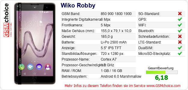 Hast du eigene Webseite? Willst du die Informationen über Standarddaten des Handys Wiko Robby irgendwo veröffentlichen? Das ist sehr einfach. Du kannst das Bild herunterladen oder kopieren und auf der Webseite folgenden Code hinzufügen:Das Einfügen von diesem Code verursacht das Anzeigen von dem folgenden Bild: