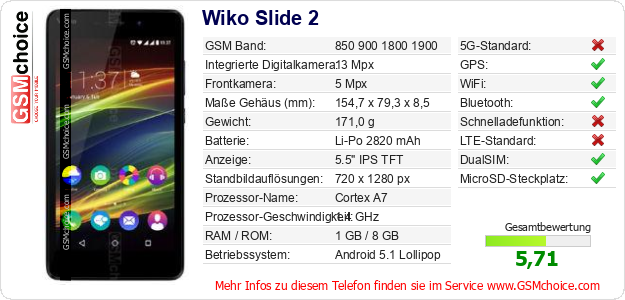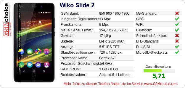 Daten des Mobiltelefons Wiko Slide 2 auf Ihrer Seite