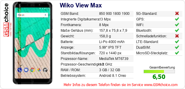 Hast du eigene Webseite? Willst du die Informationen über Standarddaten des Handys Wiko View Max irgendwo veröffentlichen? Das ist sehr einfach. Du kannst das Bild herunterladen oder kopieren und auf der Webseite folgenden Code hinzufügen:Das Einfügen von diesem Code verursacht das Anzeigen von dem folgenden Bild: