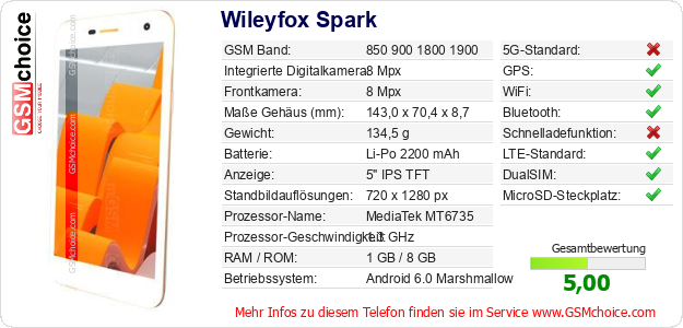 Hast du eigene Webseite? Willst du die Informationen über Standarddaten des Handys Wileyfox Spark irgendwo veröffentlichen? Das ist sehr einfach. Du kannst das Bild herunterladen oder kopieren und auf der Webseite folgenden Code hinzufügen:Das Einfügen von diesem Code verursacht das Anzeigen von dem folgenden Bild:
