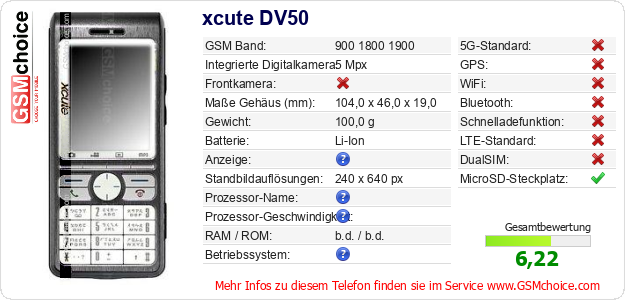 Hast du eigene Webseite? Willst du die Informationen über Standarddaten des Handys xcute DV50 irgendwo veröffentlichen? Das ist sehr einfach. Du kannst das Bild herunterladen oder kopieren und auf der Webseite folgenden Code hinzufügen:Das Einfügen von diesem Code verursacht das Anzeigen von dem folgenden Bild: