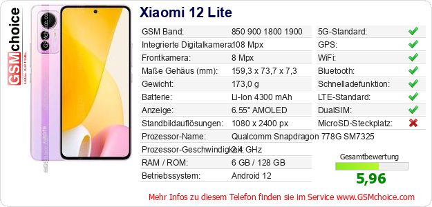 Daten des Mobiltelefons Xiaomi 12 Lite auf Ihrer Seite