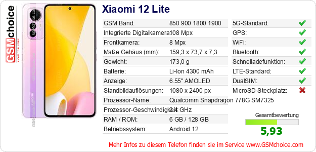 Hast du eigene Webseite? Willst du die Informationen über Standarddaten des Handys Xiaomi 12 Lite irgendwo veröffentlichen? Das ist sehr einfach. Du kannst das Bild herunterladen oder kopieren und auf der Webseite folgenden Code hinzufügen:Das Einfügen von diesem Code verursacht das Anzeigen von dem folgenden Bild: