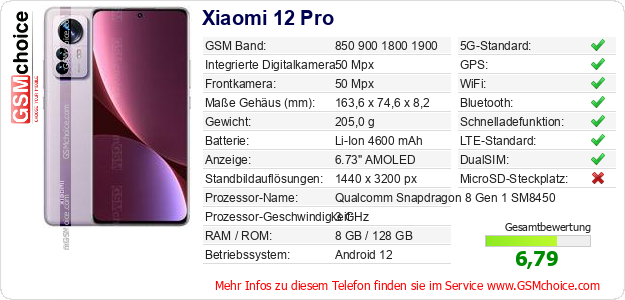 Hast du eigene Webseite? Willst du die Informationen über Standarddaten des Handys Xiaomi 12 Pro irgendwo veröffentlichen? Das ist sehr einfach. Du kannst das Bild herunterladen oder kopieren und auf der Webseite folgenden Code hinzufügen:Das Einfügen von diesem Code verursacht das Anzeigen von dem folgenden Bild: