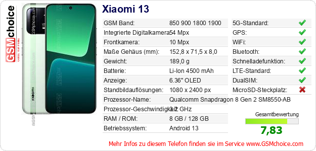 Hast du eigene Webseite? Willst du die Informationen über Standarddaten des Handys Xiaomi 13 irgendwo veröffentlichen? Das ist sehr einfach. Du kannst das Bild herunterladen oder kopieren und auf der Webseite folgenden Code hinzufügen:Das Einfügen von diesem Code verursacht das Anzeigen von dem folgenden Bild: