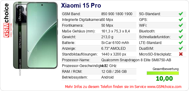 Hast du eigene Webseite? Willst du die Informationen über Standarddaten des Handys Xiaomi 15 Pro irgendwo veröffentlichen? Das ist sehr einfach. Du kannst das Bild herunterladen oder kopieren und auf der Webseite folgenden Code hinzufügen:Das Einfügen von diesem Code verursacht das Anzeigen von dem folgenden Bild: