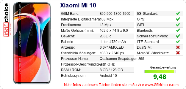 Hast du eigene Webseite? Willst du die Informationen über Standarddaten des Handys Xiaomi Mi 10 irgendwo veröffentlichen? Das ist sehr einfach. Du kannst das Bild herunterladen oder kopieren und auf der Webseite folgenden Code hinzufügen:Das Einfügen von diesem Code verursacht das Anzeigen von dem folgenden Bild: