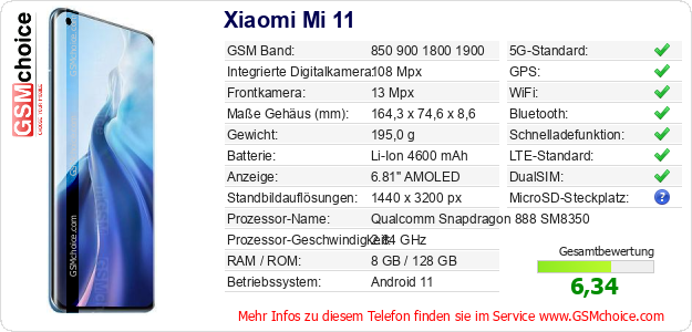 Hast du eigene Webseite? Willst du die Informationen über Standarddaten des Handys Xiaomi Mi 11 irgendwo veröffentlichen? Das ist sehr einfach. Du kannst das Bild herunterladen oder kopieren und auf der Webseite folgenden Code hinzufügen:Das Einfügen von diesem Code verursacht das Anzeigen von dem folgenden Bild: