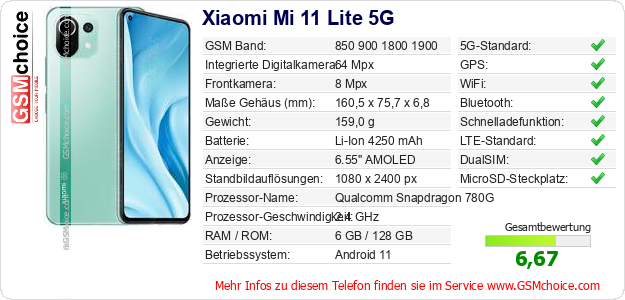 Hast du eigene Webseite? Willst du die Informationen über Standarddaten des Handys Xiaomi Mi 11 Lite 5G irgendwo veröffentlichen? Das ist sehr einfach. Du kannst das Bild herunterladen oder kopieren und auf der Webseite folgenden Code hinzufügen:Das Einfügen von diesem Code verursacht das Anzeigen von dem folgenden Bild: