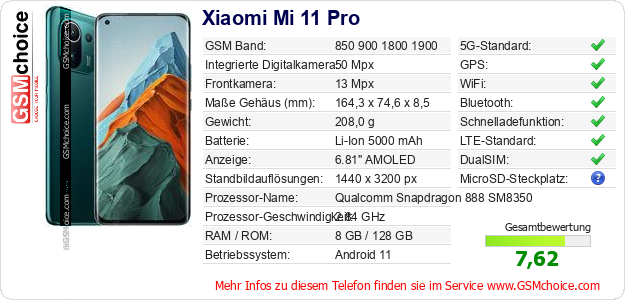Hast du eigene Webseite? Willst du die Informationen über Standarddaten des Handys Xiaomi Mi 11 Pro irgendwo veröffentlichen? Das ist sehr einfach. Du kannst das Bild herunterladen oder kopieren und auf der Webseite folgenden Code hinzufügen:Das Einfügen von diesem Code verursacht das Anzeigen von dem folgenden Bild: