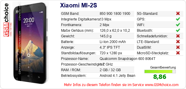 Hast du eigene Webseite? Willst du die Informationen über Standarddaten des Handys Xiaomi MI-2S irgendwo veröffentlichen? Das ist sehr einfach. Du kannst das Bild herunterladen oder kopieren und auf der Webseite folgenden Code hinzufügen:Das Einfügen von diesem Code verursacht das Anzeigen von dem folgenden Bild: