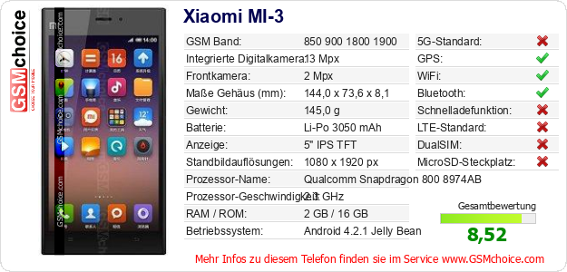 Hast du eigene Webseite? Willst du die Informationen über Standarddaten des Handys Xiaomi MI-3 irgendwo veröffentlichen? Das ist sehr einfach. Du kannst das Bild herunterladen oder kopieren und auf der Webseite folgenden Code hinzufügen:Das Einfügen von diesem Code verursacht das Anzeigen von dem folgenden Bild: