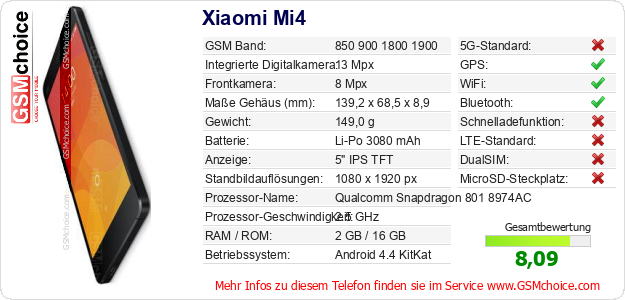 Hast du eigene Webseite? Willst du die Informationen über Standarddaten des Handys Xiaomi Mi4 irgendwo veröffentlichen? Das ist sehr einfach. Du kannst das Bild herunterladen oder kopieren und auf der Webseite folgenden Code hinzufügen:Das Einfügen von diesem Code verursacht das Anzeigen von dem folgenden Bild: