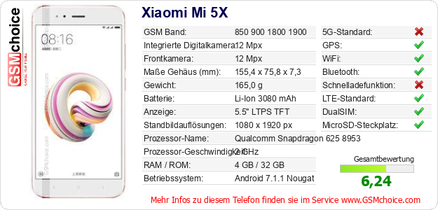Hast du eigene Webseite? Willst du die Informationen über Standarddaten des Handys Xiaomi Mi 5X irgendwo veröffentlichen? Das ist sehr einfach. Du kannst das Bild herunterladen oder kopieren und auf der Webseite folgenden Code hinzufügen:Das Einfügen von diesem Code verursacht das Anzeigen von dem folgenden Bild: