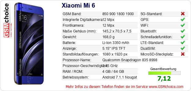 Hast du eigene Webseite? Willst du die Informationen über Standarddaten des Handys Xiaomi Mi 6 irgendwo veröffentlichen? Das ist sehr einfach. Du kannst das Bild herunterladen oder kopieren und auf der Webseite folgenden Code hinzufügen:Das Einfügen von diesem Code verursacht das Anzeigen von dem folgenden Bild: