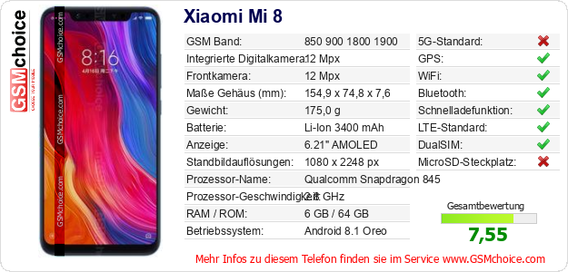 Hast du eigene Webseite? Willst du die Informationen über Standarddaten des Handys Xiaomi Mi 8 irgendwo veröffentlichen? Das ist sehr einfach. Du kannst das Bild herunterladen oder kopieren und auf der Webseite folgenden Code hinzufügen:Das Einfügen von diesem Code verursacht das Anzeigen von dem folgenden Bild: