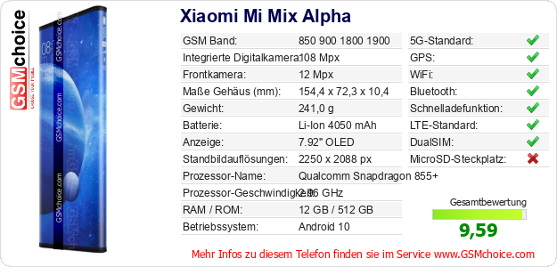 Hast du eigene Webseite? Willst du die Informationen über Standarddaten des Handys Xiaomi Mi Mix Alpha irgendwo veröffentlichen? Das ist sehr einfach. Du kannst das Bild herunterladen oder kopieren und auf der Webseite folgenden Code hinzufügen:Das Einfügen von diesem Code verursacht das Anzeigen von dem folgenden Bild: