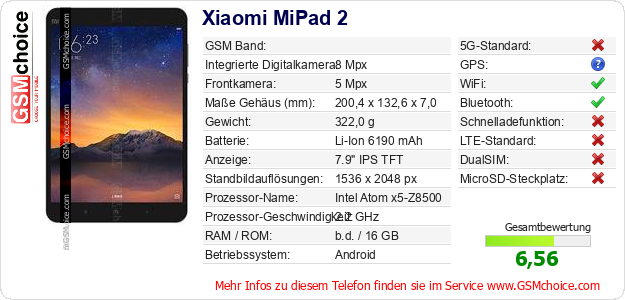 Hast du eigene Webseite? Willst du die Informationen über Standarddaten des Handys Xiaomi MiPad 2 irgendwo veröffentlichen? Das ist sehr einfach. Du kannst das Bild herunterladen oder kopieren und auf der Webseite folgenden Code hinzufügen:Das Einfügen von diesem Code verursacht das Anzeigen von dem folgenden Bild: