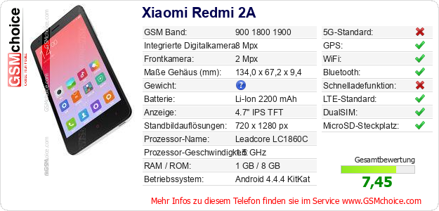 Hast du eigene Webseite? Willst du die Informationen über Standarddaten des Handys Xiaomi Redmi 2A irgendwo veröffentlichen? Das ist sehr einfach. Du kannst das Bild herunterladen oder kopieren und auf der Webseite folgenden Code hinzufügen:Das Einfügen von diesem Code verursacht das Anzeigen von dem folgenden Bild: